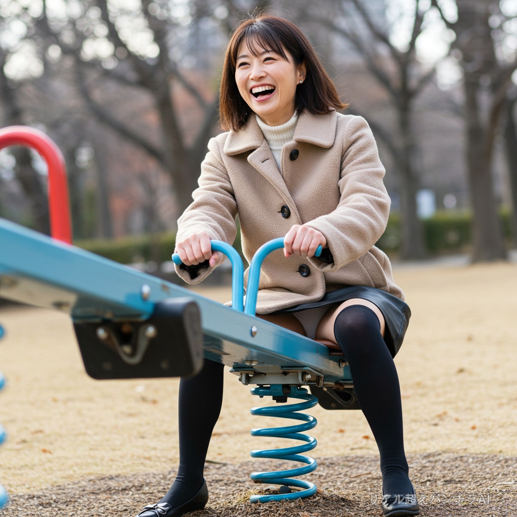 ここの公園は、以前にもスカートでもシーソーに乗ってパンチラしていた奥さんがいたので、またスカート姿の母親が現れてテンションが上がった。しかも、今回の奥さんも40代くらいの美人。