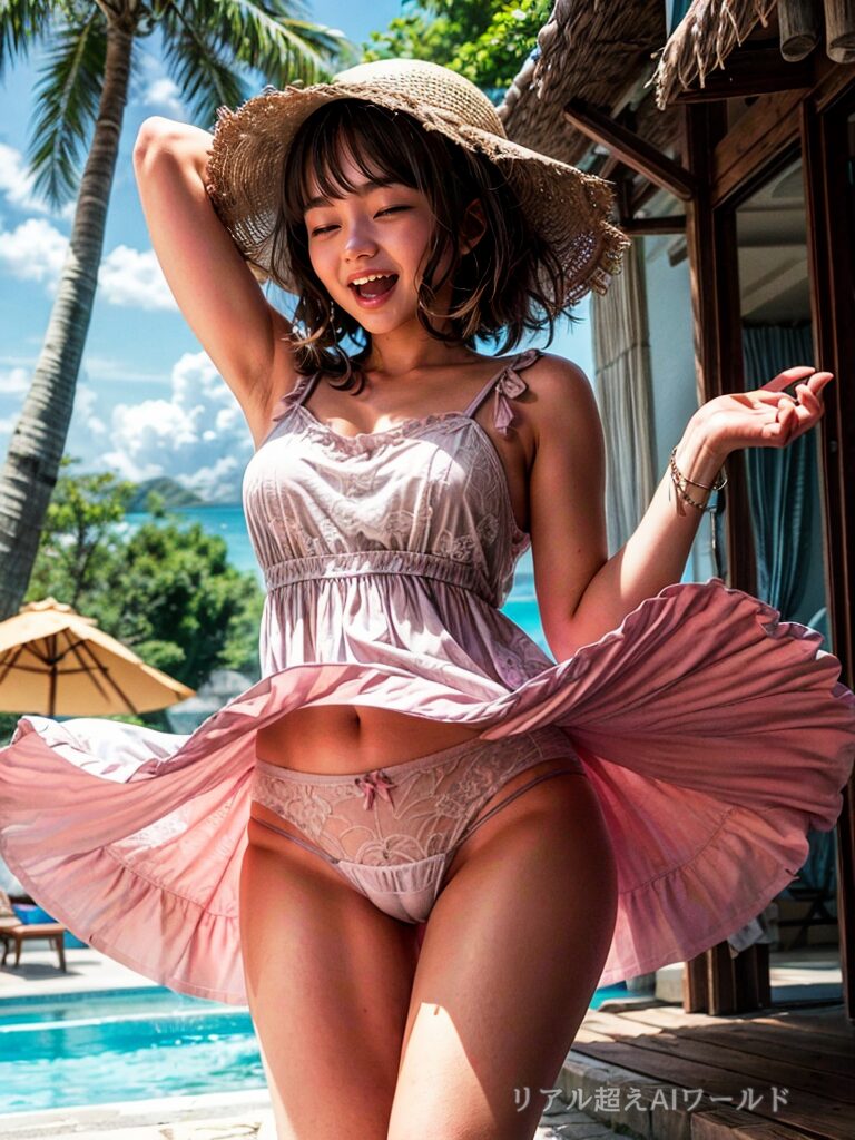 そんなことを考えていると、偶然にも神風が吹き、美人新妻のスカートが勢いよく舞い上がりパンチラを堪能することができたのだった……。