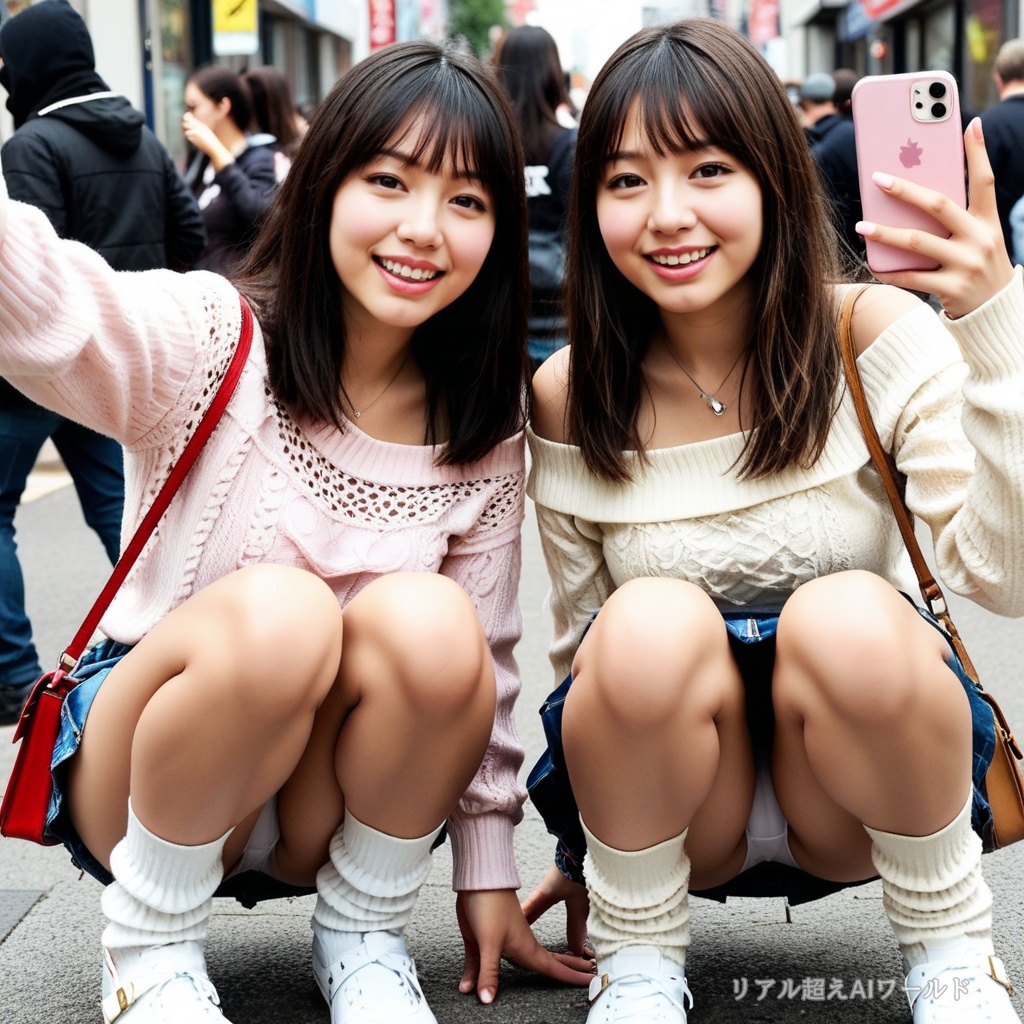 2人とも結構長いスカートですが、ワンちゃんに夢中で腰を深く落としてしゃがむので、ワンピースの中のパンツが見えてしまいます。