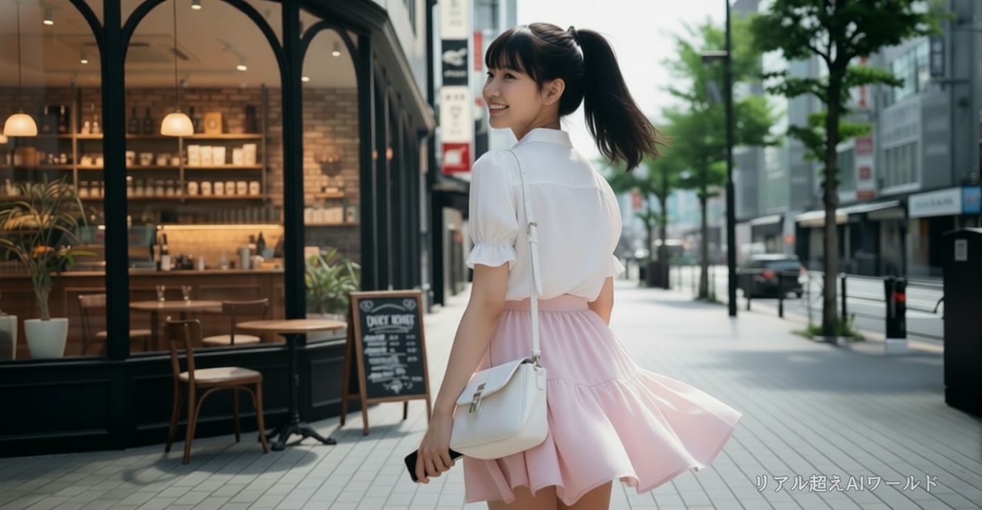薄いピンクのミニスカートが風にひらひら揺れて、太ももが見えるだけでもうドキドキが止まらない。