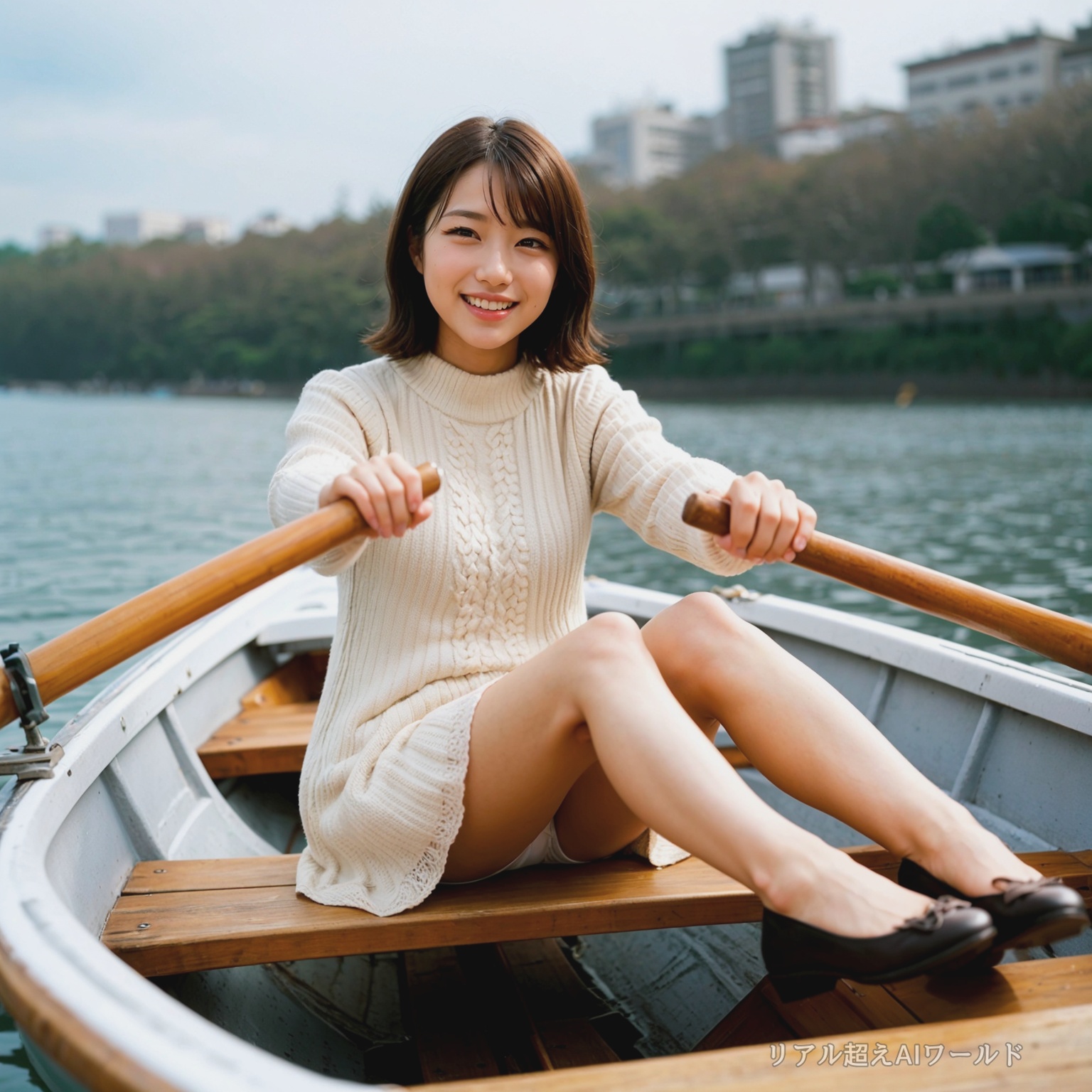 パンチラに気づかず、笑顔でボートを漕いでる女性たち。太ももから見えるパンツをじっくり覗けるシチュエーションになります。
