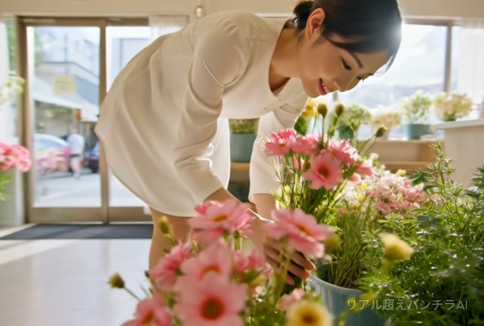 清楚で優しい雰囲気の花屋の店員さん。 前かがみになってお尻を突き出したスカートの中を隠し撮り。花の手入れや整理をしてる姿をローアングル直下から覗き見しちゃう動画です。 白やピンクを始め、色んな色のパンツが丸見えに。一部、しゃがみや逆さフロント(若干数)なども