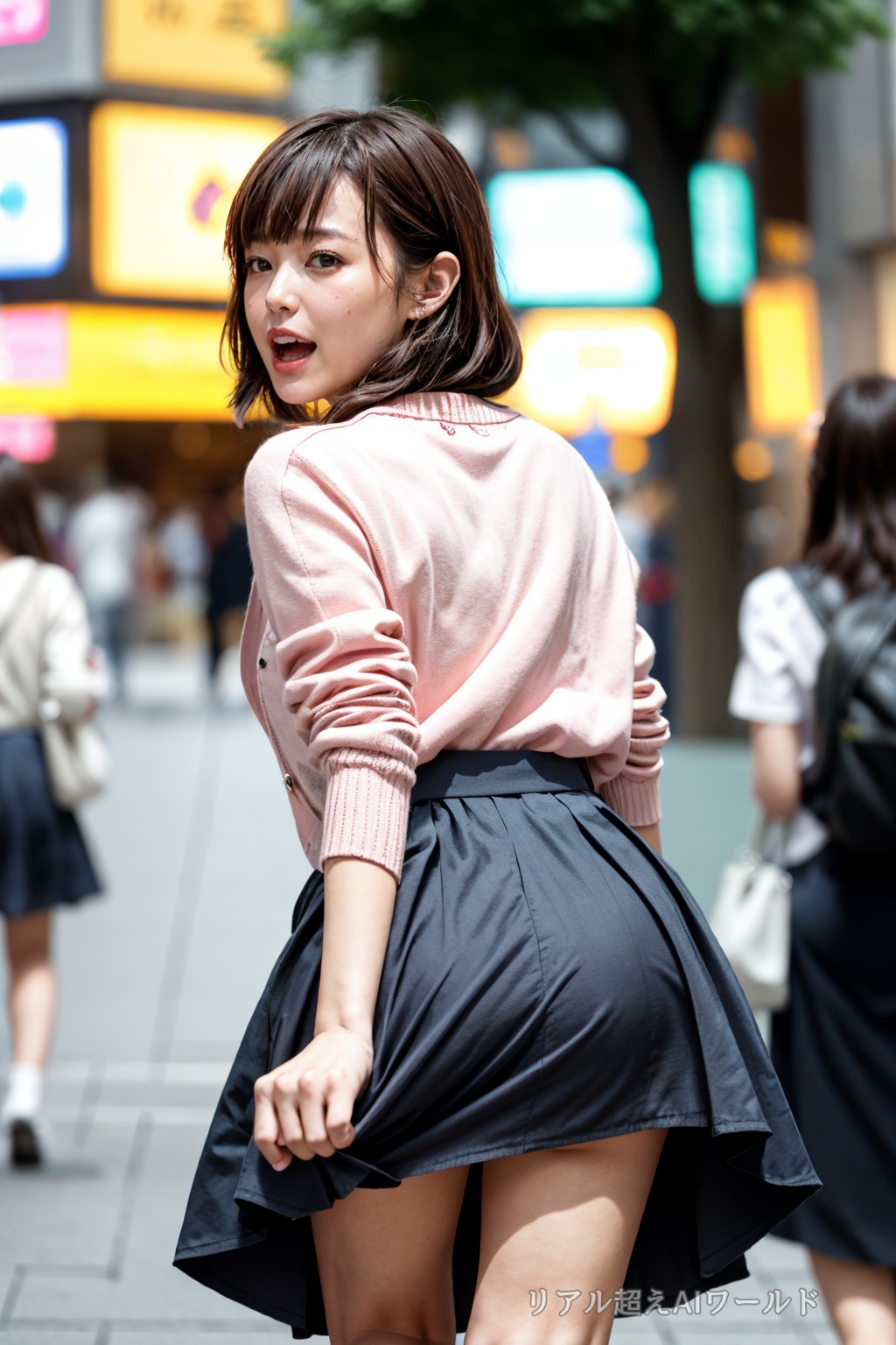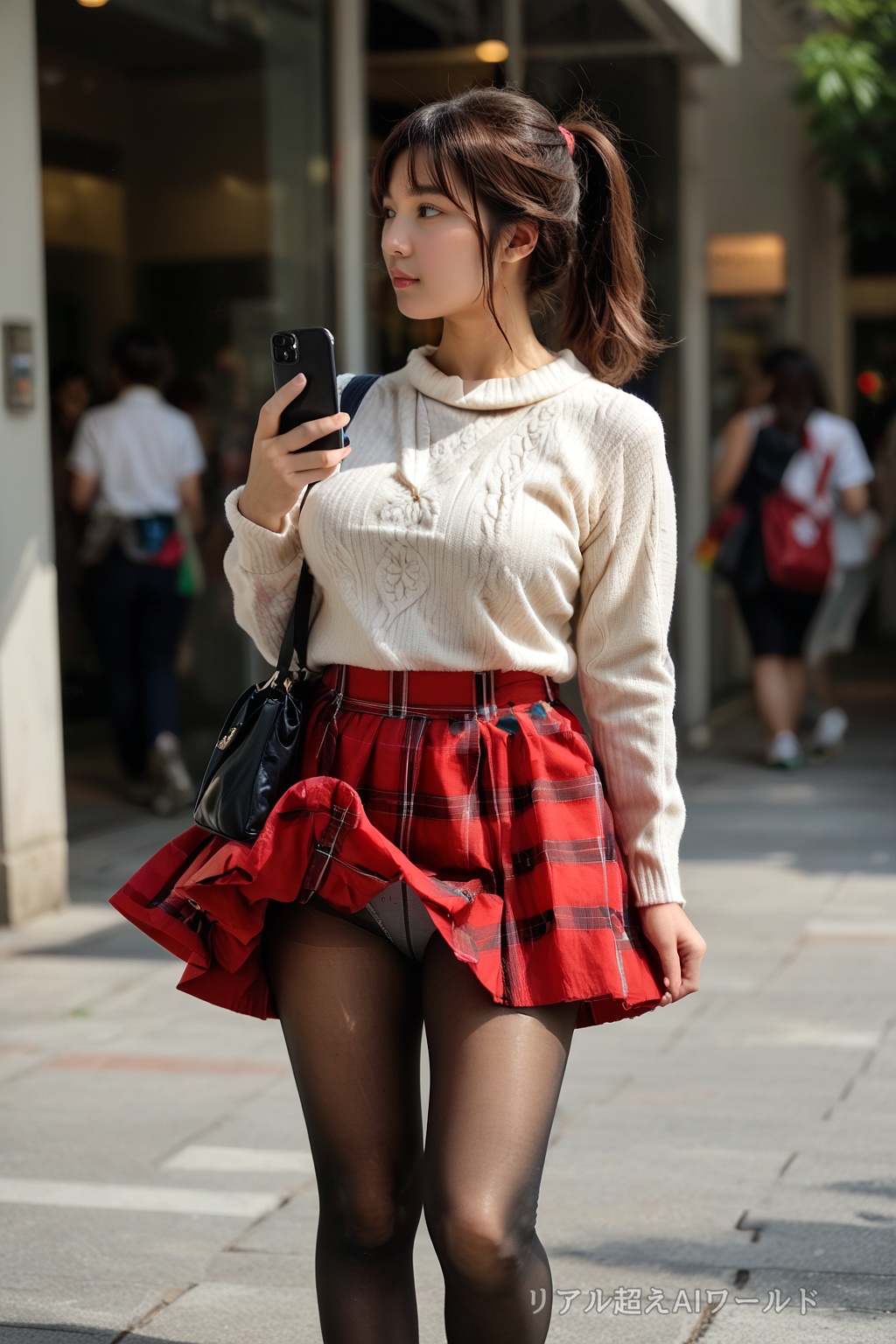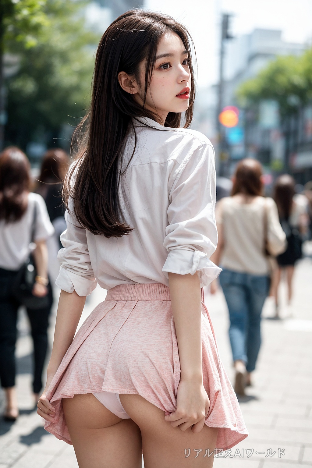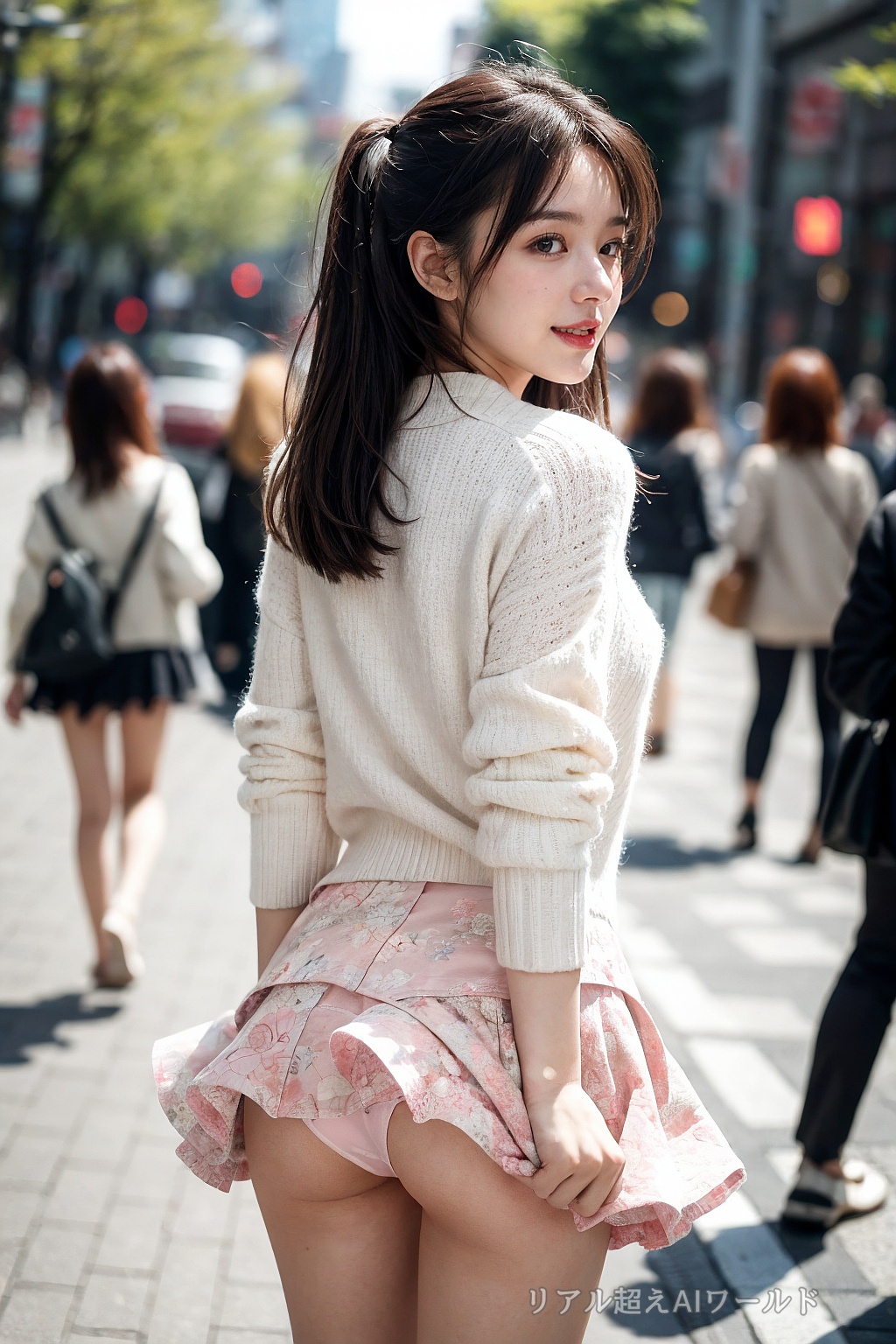 スカートがめくれて慌てて手で隠していたり、気づかずに笑顔のままだったりとシリーズや画像によって、様々なバリエーションがあります。